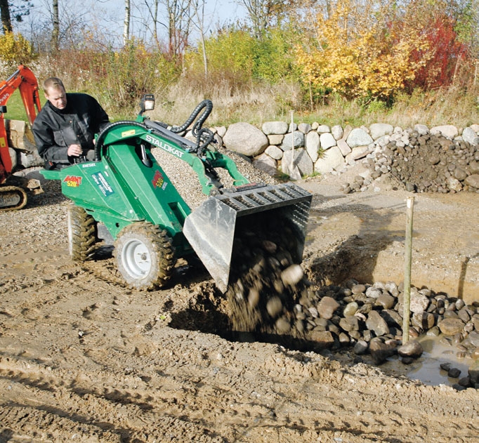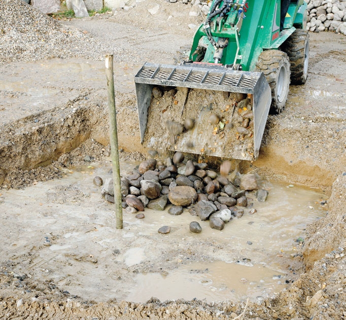 Vi sorterer steinene med ei skuffe. Er det svært store steiner innimellom, er det en god idé å fjerne disse fordi de vil redusere størrelsen på hulrommet når du skal fylle utgravningen med jord.