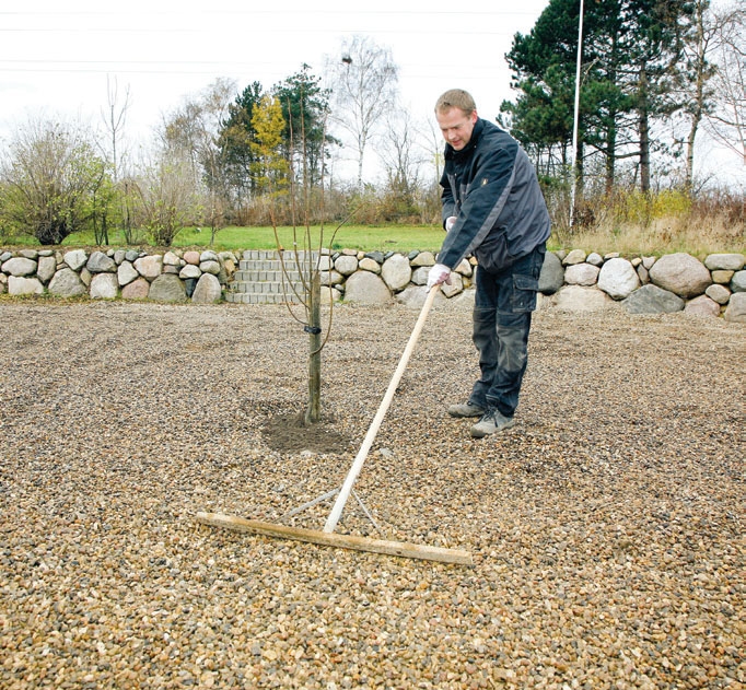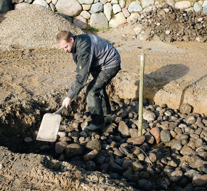 Det er viktig at steinene blir fordelt i et ensartet og jevnt lag i utgravningen som i vårt tilfelle er tre meter hver vei og en halv meter dyp. Til større trær bør dybden være minimum en meter for at treet skal trives.
