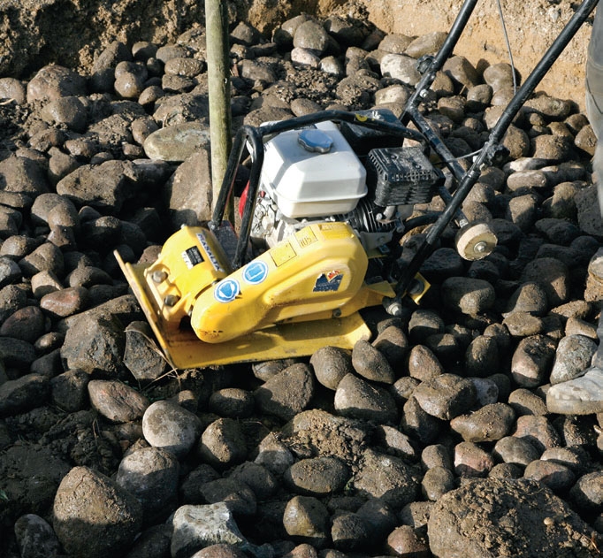 Begynn med å vibrere steingropa langs kantene, og arbeid deg deretter inn mot sentrum der oppbindingsstokken er plassert. Selv om du ikke skal legge heller over utgravningen, er det viktig at overflata blir så vannrett som mulig.