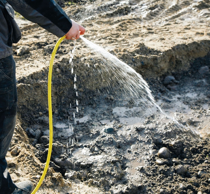 Når første jordlaget er på plass, vannes jorda forsiktig slik at den siver sakte ned mellom steinene. Er det steder der jorda nærmest etterlater store hull mellom steinene, må du fylle etter mer jord.