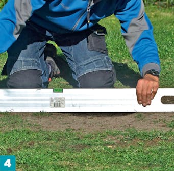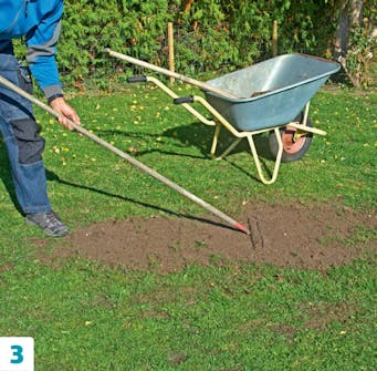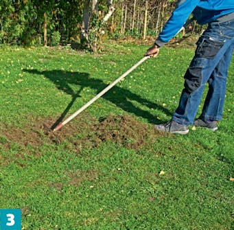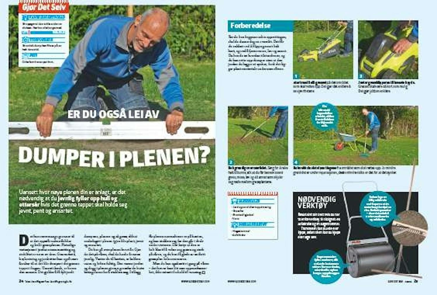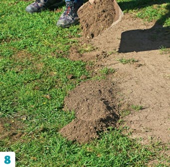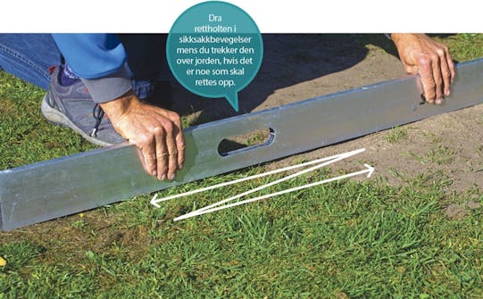 Start med å slå gresset på det området som skal rettes opp. Det gjør det enklere å se ujevnhetene.