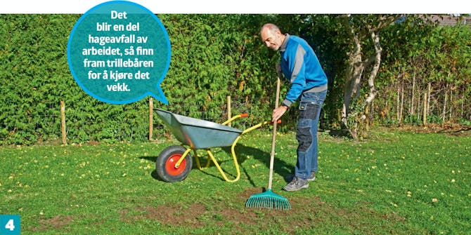 Før du kan begynne selve opprettingen, skal du danne deg en oversikt. Det får du enklest ved å klippe gresset helt kort, og ved å fjerne mose, løv og annet. Da kan du se hvordan tilstanden er, og du kan rette opp dumper uten at den jorden du legger ut synker, fordi det ligger plantemateriale under som råtner.