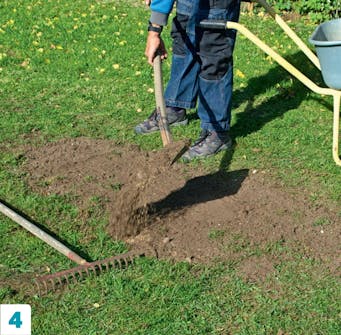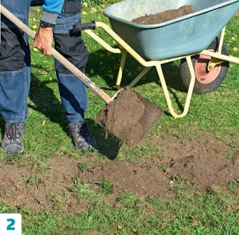 Fordel en passe mengde jord på området. Legg ut jorden i små hauger. Det gjør det enklere å vurdere hvor mye jord som skal til for å fylle opp fordypningen.