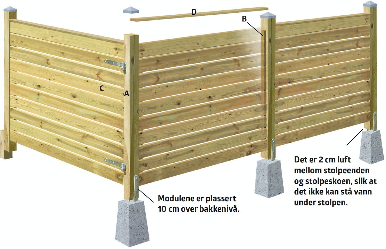 Legg stolpen (A) på gjerdemodulen, og mål opp hvor den skal plasseres. Du skal blant annet vite hvor mye “luft” det skal være under modulene når de settes i stolpe skoene. Her passer det med 10 cm.
