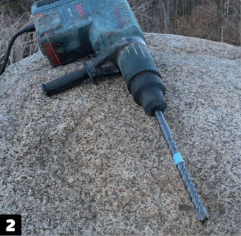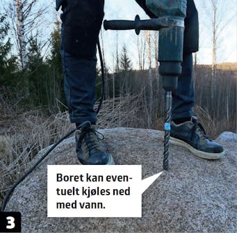 Fjell, stein og berggrunn er hardt, og det krever kraftig verktøy å bore i det. Til vårt 15 cm dype hull med en diameter på 24 mm, leide vi en kraftig borhammer på 11 kilo, med SDS max-feste. Med den boret vi hullet enkelt i løpet av et par minutter.