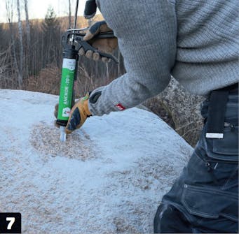 Forankringsmassen sprøytes ned i hullet, til et par centimeter under kanten. Her bruker vi en tokomponent masse som også kan brukes i kuldegrader.