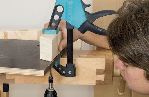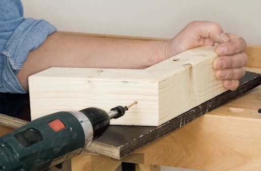 Spenn fast det sentrerte lektestykket på forskalingsplaten, og skru det fast fra undersiden. Her bruker vi en 4 x 55 mm skrue.
