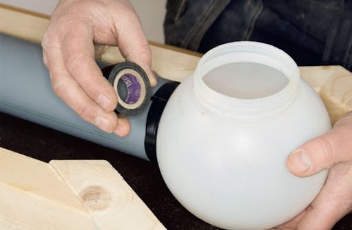Vi velger å teipe fast røret til kuppelen. Hvis du vil ofre lampekuppelen, så vil røret sitte bedre fast hvis du limer det fast med smeltelim. Men med forsiktig behandling fungerer teip også.