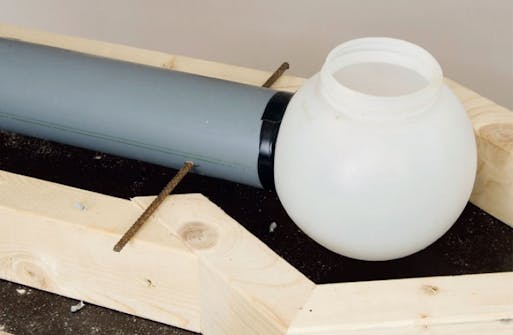 Nå skal det lages en form som kan legges ned i støpeformen, slik at betongen blir til en vannrenne. Til den lange rennen bruker vi et 75 mm plast rør. Det var verre å finne et velegnet plast produkt med kuleform. Men hos Biltema fant vi en lampekuppel. Det kaller de kulen, selv om den er av plastikk.