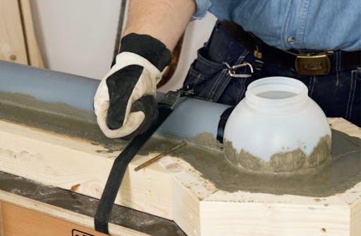 Fjern overskytende betong før røret spennes fast til støpeformen med to strammebånd. Bruk et bånd i hver ende av røret. Legg plast over, slik at betongen ikke tørker for raskt.