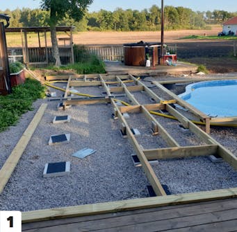 En annen fordel med å bygge et tredekke rundt bassenget, er at det er mye enklere å tilpasse treverk enn fliser eller stein til de runde formene. Rammen til terrassen er bygget med impregnert 48 x 148 mm, og terrassegulvet er laget av 28 x 120 mm terrassebord.