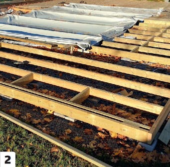 Hele bunnrammen til terrassen bygges av impregnert 48 x 148 mm. Rammen rettes opp på 30 x 30 cm betongheller, som ligger helt stabilt på bunnen av grus.