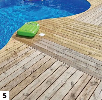 Bassengets organiske form skal videreføres til terrassebordene. Den enkleste og peneste måten å gjøre dette på, er ved å montere terrassebordene og deretter skjære de buede formene med en stikksag. For å beskytte lineren kan du legge en masonittplate mellom sagbladet og lineren når du skjærer - men du må likevel være forsiktig!
