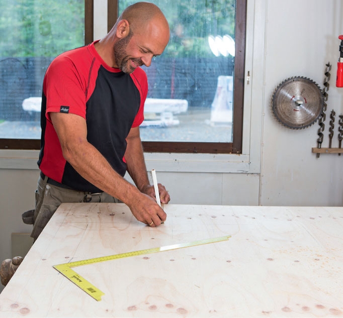 Det er en god idé å tegne opp en “hylleknekt” på en plate. Da har du en mal å rette deg inn etter når du bygger, slik at du er trygg på at stativets to deler blir identiske. Du skal lage flere skrå hakk som sikrer at emnene ikke sklir mot hverandre. Innfellingene gjør konstruksjonen ekstra sterk. Det er viktig at oppmålingen til hakkene er nøyaktig, slik at du ikke får problemer med å sette sammen delene.