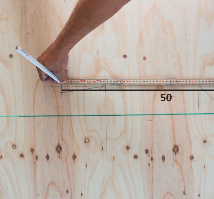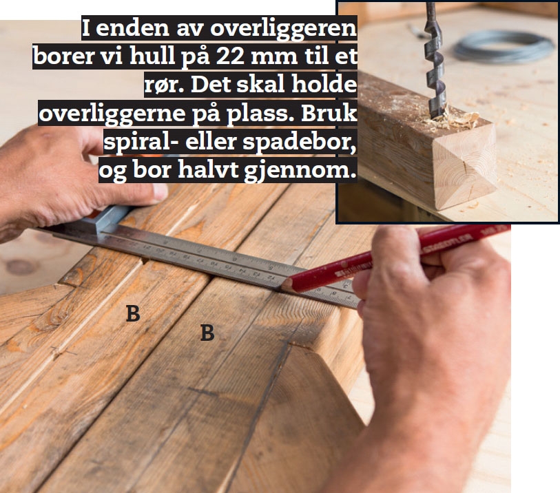 Tegn opp til skråstiveren (C) på platen. Da vet du nøyaktig hvor du skal lage hakk i stolpene. Skråstiveren skal plasseres med 45 graders vinkel på stolpene. Tegn opp til et hakk 50 cm fra stolpens bakkant og ut på overliggeren (B).