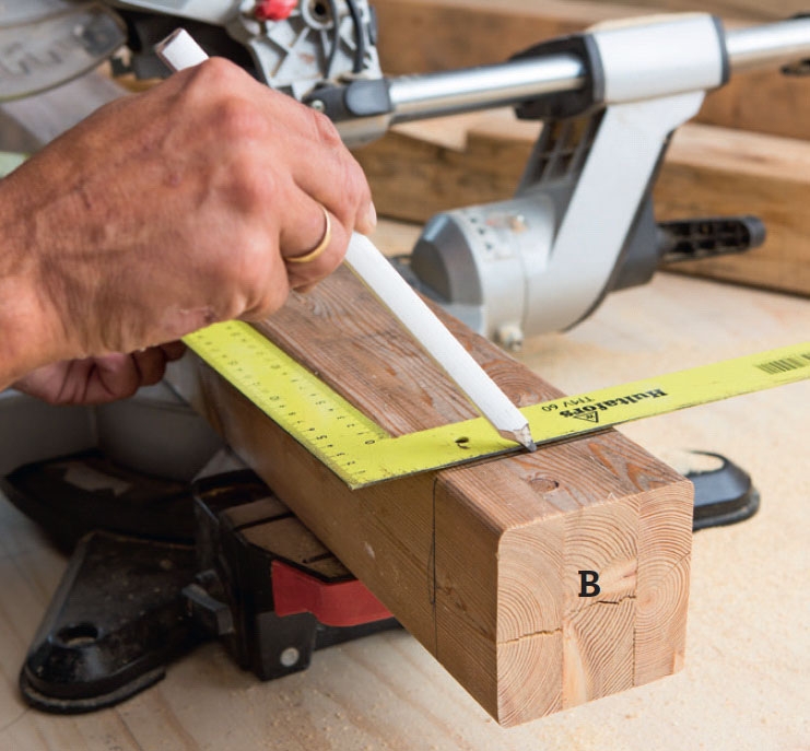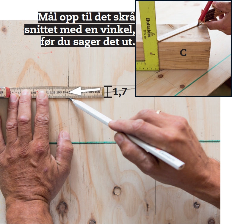 Merk opp det skrå hakket til stiveren (C). Plasser den på platen, og tegn opp hvor over- og undersiden går inn i stolpen (A) og overliggeren (B). Hakket er skrått, og 1,7 cm dypt ved bakerste kant (tilsvarende en tommestokkbredde).