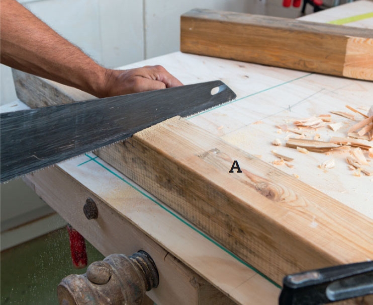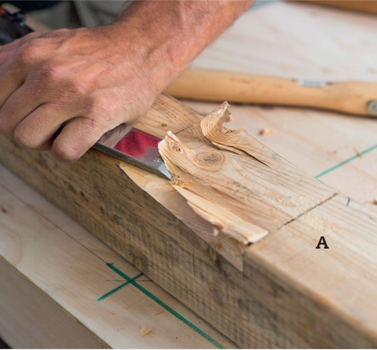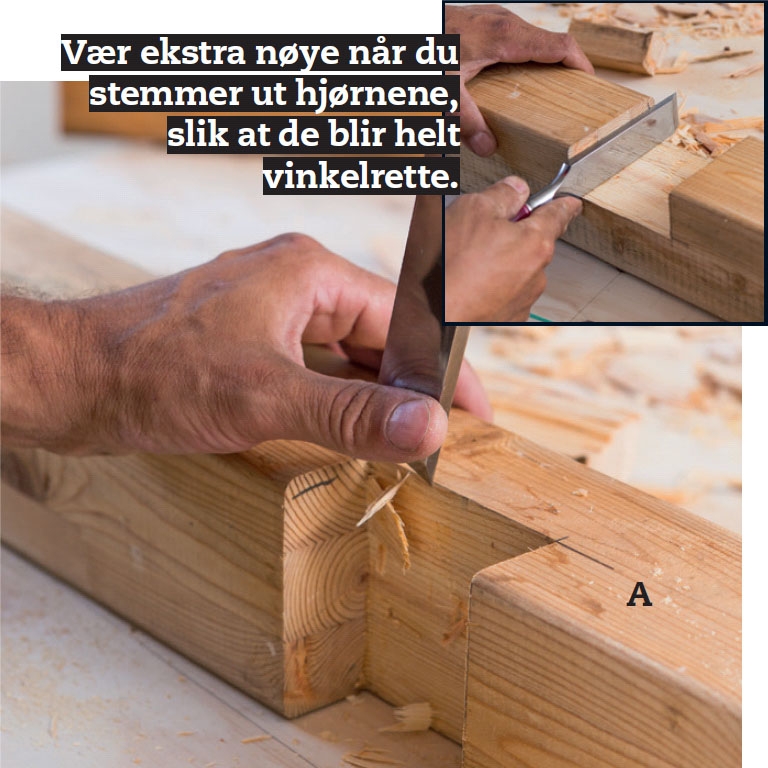 Lag et sagsnitt med en håndsag i stolpen (A) der det skrå hakket til skråstiveren (C) skal være. Med et skarpt snitt i stolpen, er det lettere å stemme ut slik at det blir pent.