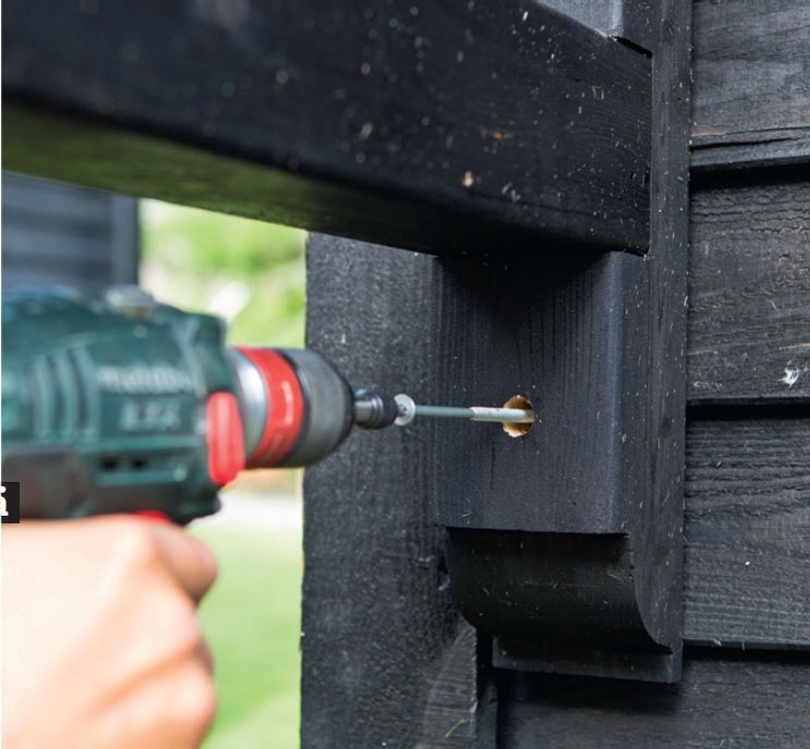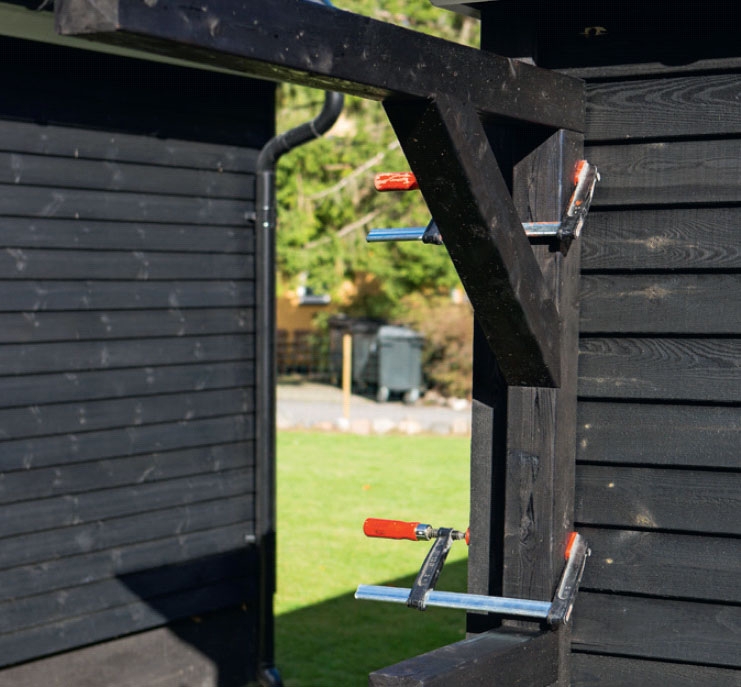 Delene settes sammen med både lim og skruer. Smør et godt, vannfast lim på delene som skal settes sammen, og skru dem med 6 x 180 mm skruer.
