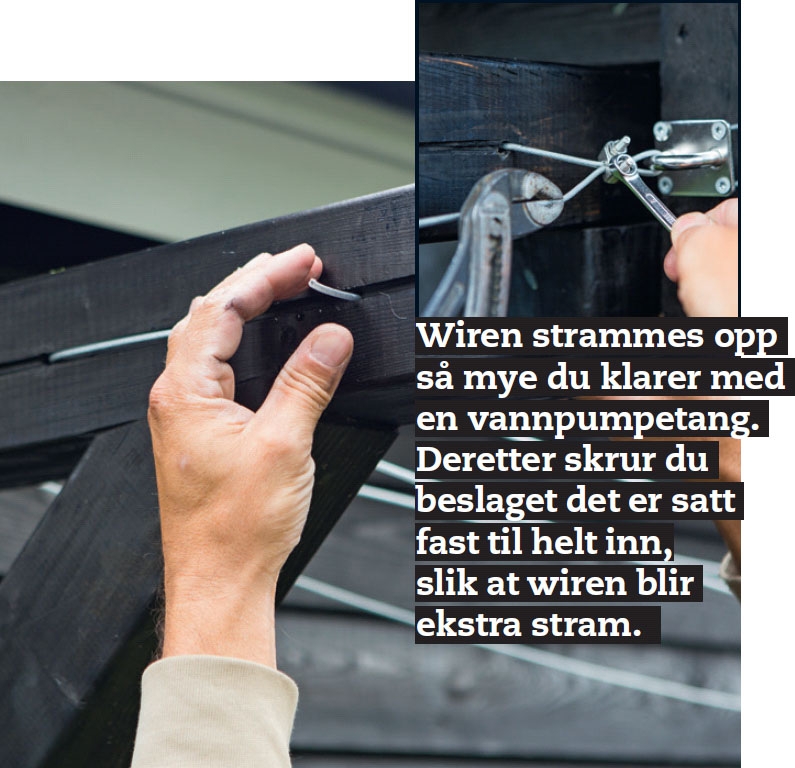 Trekk wiren gjennom hullene. Begynn ved det ytterste hullet i overliggeren, og beveg deg bakover mot veggen. Stram opp wiren for hver lengde du trekker gjennom. Wiren festes til et beslag på veggen, som bare akkurat skrus fast.