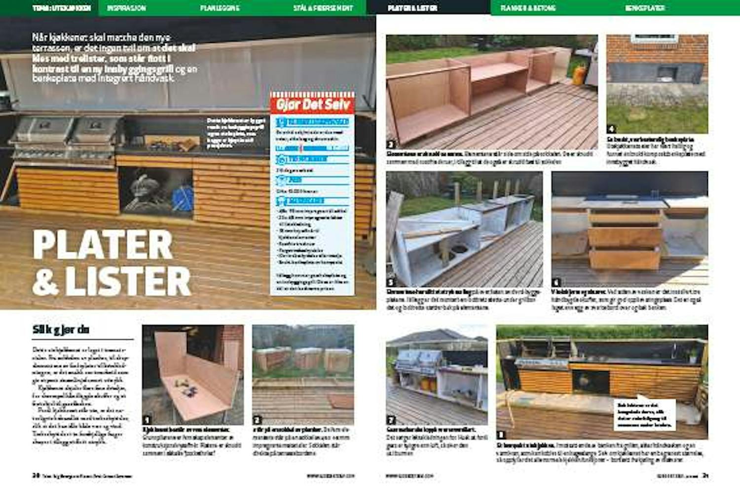 Dette utekjøkkenet er laget i trematerialer. Fra sokkelen av planker, til skapelementene av finérplater til listekledningen, er det snakk om trearbeid som gir et pent strømlinjeformet uttrykk.