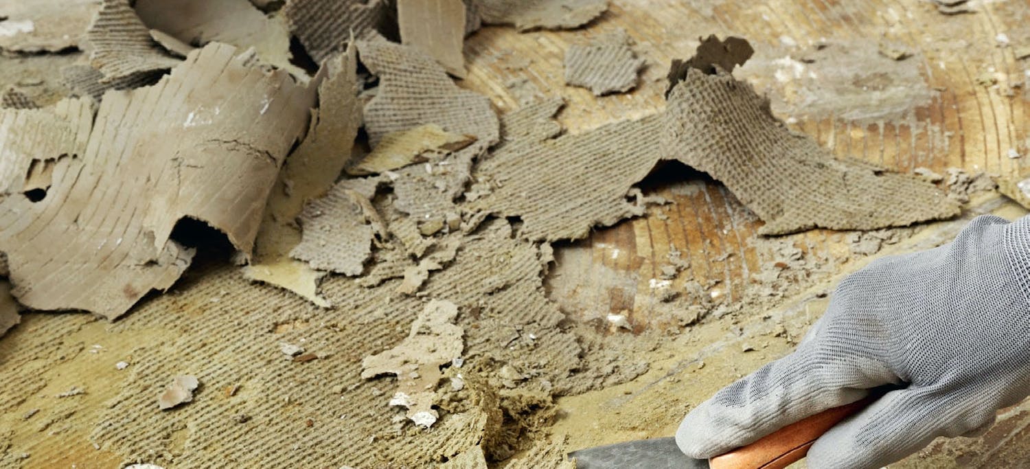 Et gammelt teppe som er limt på, kan være enkelt å dra av, men som regel sitter skumbelegget fra baksiden av teppet igjen på gulvet. Det fjernes manuelt med en sparkel. De siste restene av limet fjernes med whitespirit eller rødsprit og en klut. Er ikke det nok, må du bruke en grovkornet slipemaskin eller høvle gulvet rent.