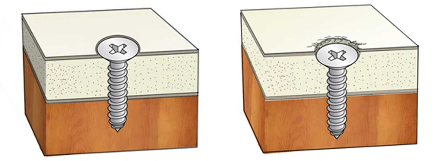 Skruene må jo sitte godt fast, tenker du, og kjører gipsskruen godt ned i platen. Tanken er god nok, men metoden er helt feil, for gipsskruen skal bare akkurat få tak i platen og skjelettet bak, og trekke delene sammen. Ellers går det galt.