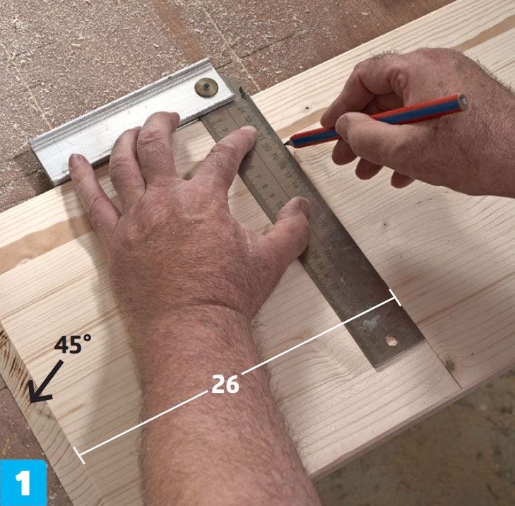 Første side strekes opp. Vi har allerede kappet den ene siden med et 45 graders snitt, slik at vi kan streke opp det innvendige målet. Her til en kortside, som er 26 cm.