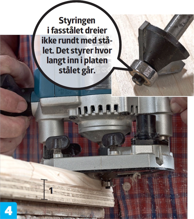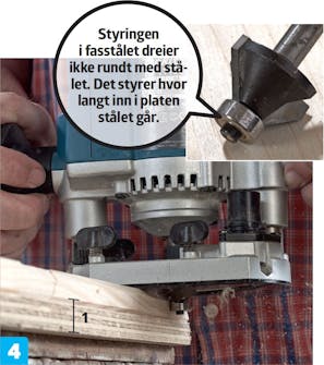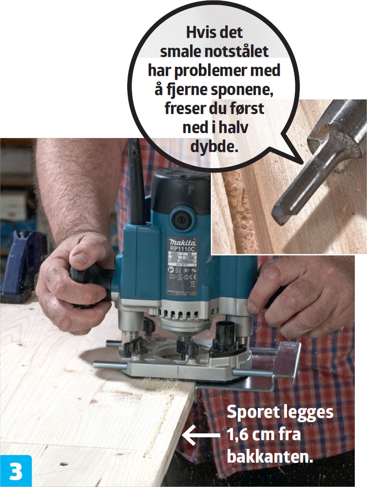 Sporet til bakkledningen freses med et notstål. Fordi vi bruker 4 mm kryss finér til bakplaten, freser vi sporet til bakplaten med et 4 mm notfresestål. Sporet freses 10 mm dypt, eventuelt i flere omganger.