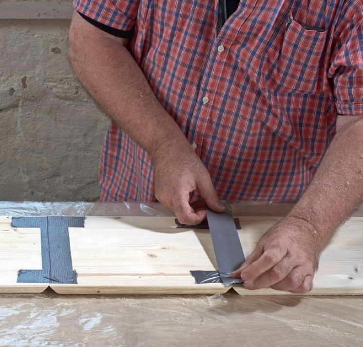 Sidene teipes sammen. Sidene til kassen legges helt tett sammen med de utvendige sidene opp. For- og bakkant skal flukte nøyaktig. Legg et kraftig teipstykke over de tre skjøtene, og press den godt til, slik at skjøtene sitter tett sammen. Husk å sjekke at sporene til bakplaten ligger i den samme siden på alle.