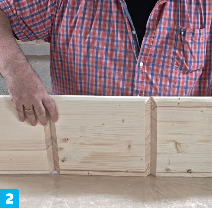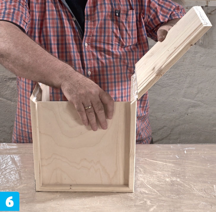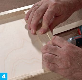 Listene sages ut som klosser og limes fast til bakkledningen og kassekanten. Sett eventuelt små skruer gjennom bakplaten til å holde fast listene mens limet tørker.