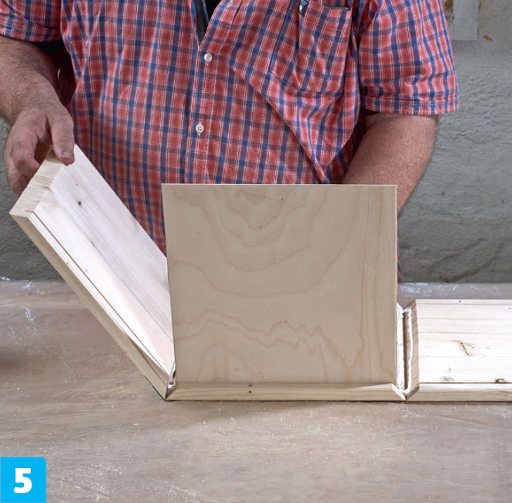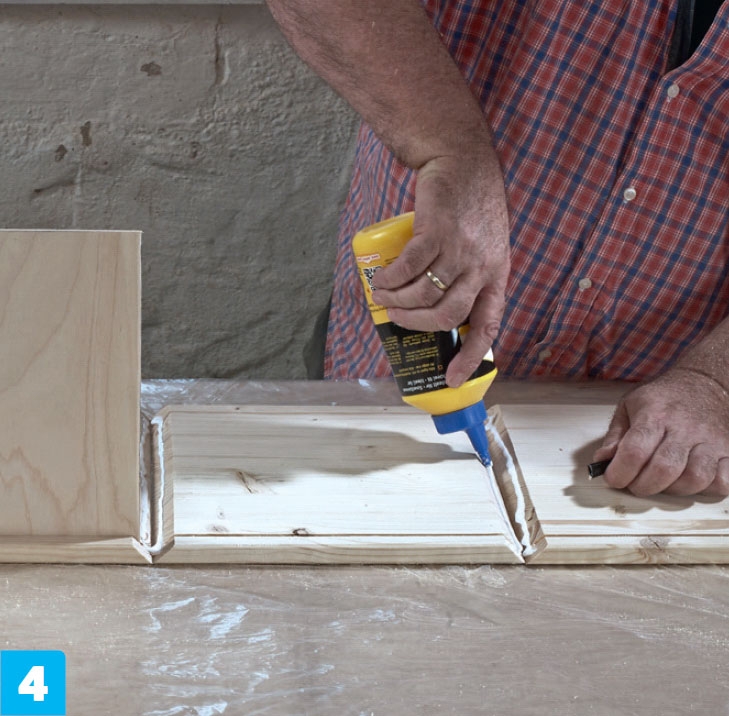 Legg lim i spor og grøfter. Både de tynne, freste sporene til bakplaten, og de skrå kantene smøres med så mye lim at det presses litt ut når kassen settes sammen.