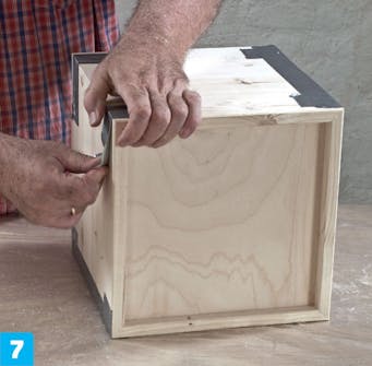 Kassene settes sammen uten verken tapper, fingerskjøter eller plugger - ikke engang spiker eller skruer bruker vi. Vanlig trelim vil holde kassen solid sammen, og til å spenne sidene rundt bakplaten mens de limes, bruker vi et meget enkelt verktøy: gaff ateip.