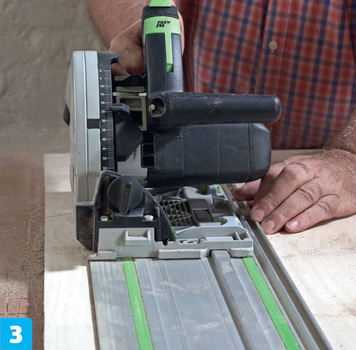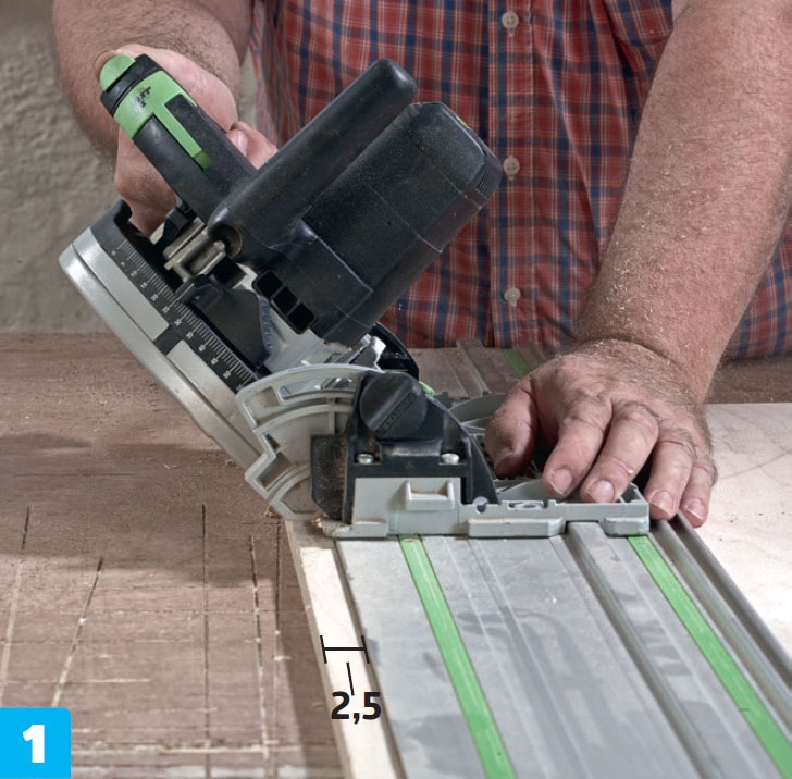 Neste listedel skjæres ut. Platen har nå en skråkant, så dykksagen justeres til 90 grader, føringsskinnen flyttes inn og den neste listen med skrå kant sages ut. I alt har du bruk for drøyt fire meter list med skråkant.
