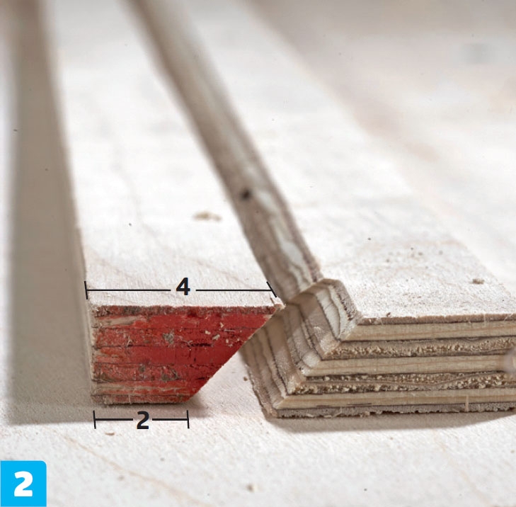 Opphengslistene lages. Føringsskinnen legges 2,5 cm fra kanten på kryss finér-platen. Bladet vippes til 45 grader, og en lang list med skrå kant skjæres ut. Sag-sporet er 5 mm, så siden av listen er 2 cm.