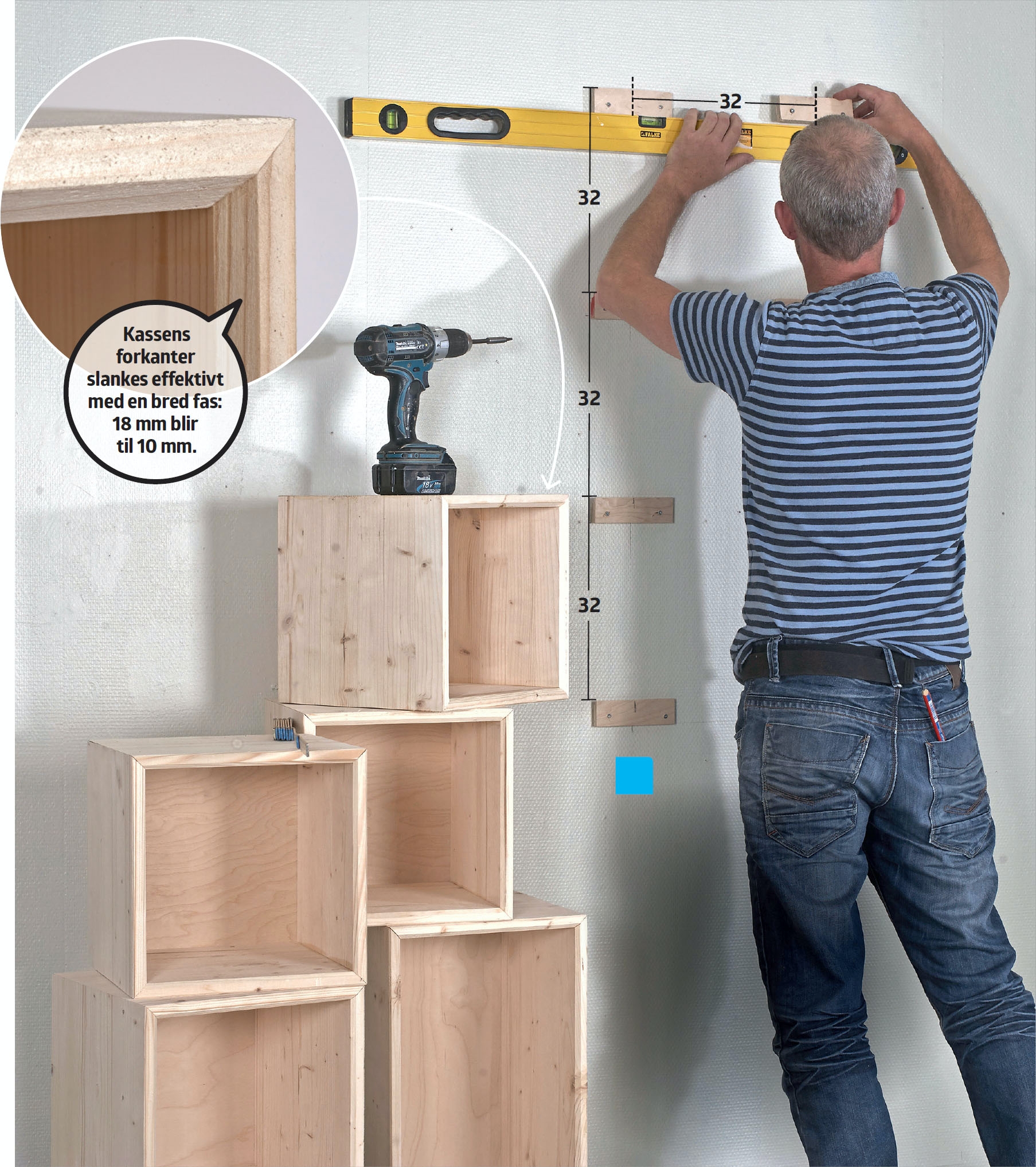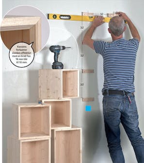 Opphenget består i prinsippet av korte lister, som du deler på langs med et 45 graders snitt. Den ene delen limes fast på bakplaten i oversiden, den andre delen settes på veggen - de skrå snittene vendes, slik at kassen griper fatt i listen på veggen. For å lette arbeidet, skjæres delene ut av en plate.