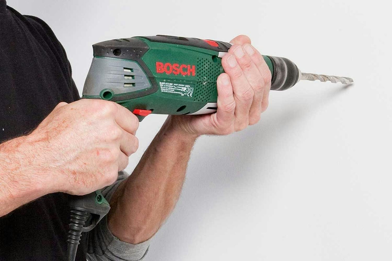 Sørg for å holde bormaskinen rett, ellers blir hullet, og dermed opphenget ditt, skjevt. Sett boret mot veggen, trekk hodet tilbake, og vurder vinkelen før du borer.