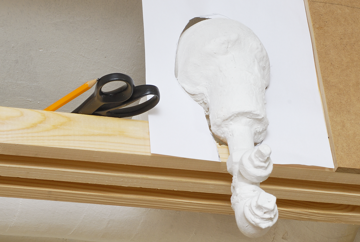 Jeg har en nesten umulig oppgave foran meg: Midt i en kledning som jeg er i ferd med å sette opp i kjelleren, stikker det ut et gammelt rør av veggen. Jeg vil helst slippe å flytte på røret, men hvordan får jeg skåret ut veggplaten i en så underlig form som dette blir?