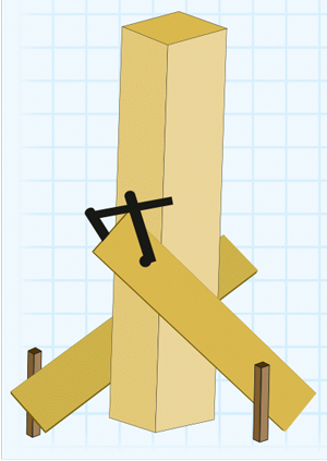 Du slår et par korte pinner i bakken, et lite stykke på begge sider av stolpen du skal sette opp. Deretter lager du to skråstivere av et par bord, som du fester med tvinger til stolpen i den ene enden, og til de små støttepinnene i den andre. Vinkelen ned til støttepinnene skal være cirka 45 grader. Dermed står stolpen solid fast mens du jobber.