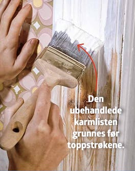 Mal listverket med pensel et første strøk. Her brukes en liten pensel, fordi det er enklest på smalt listverk. Etterpå skal det første strøket få lov til å tørke omtrent ett døgn.