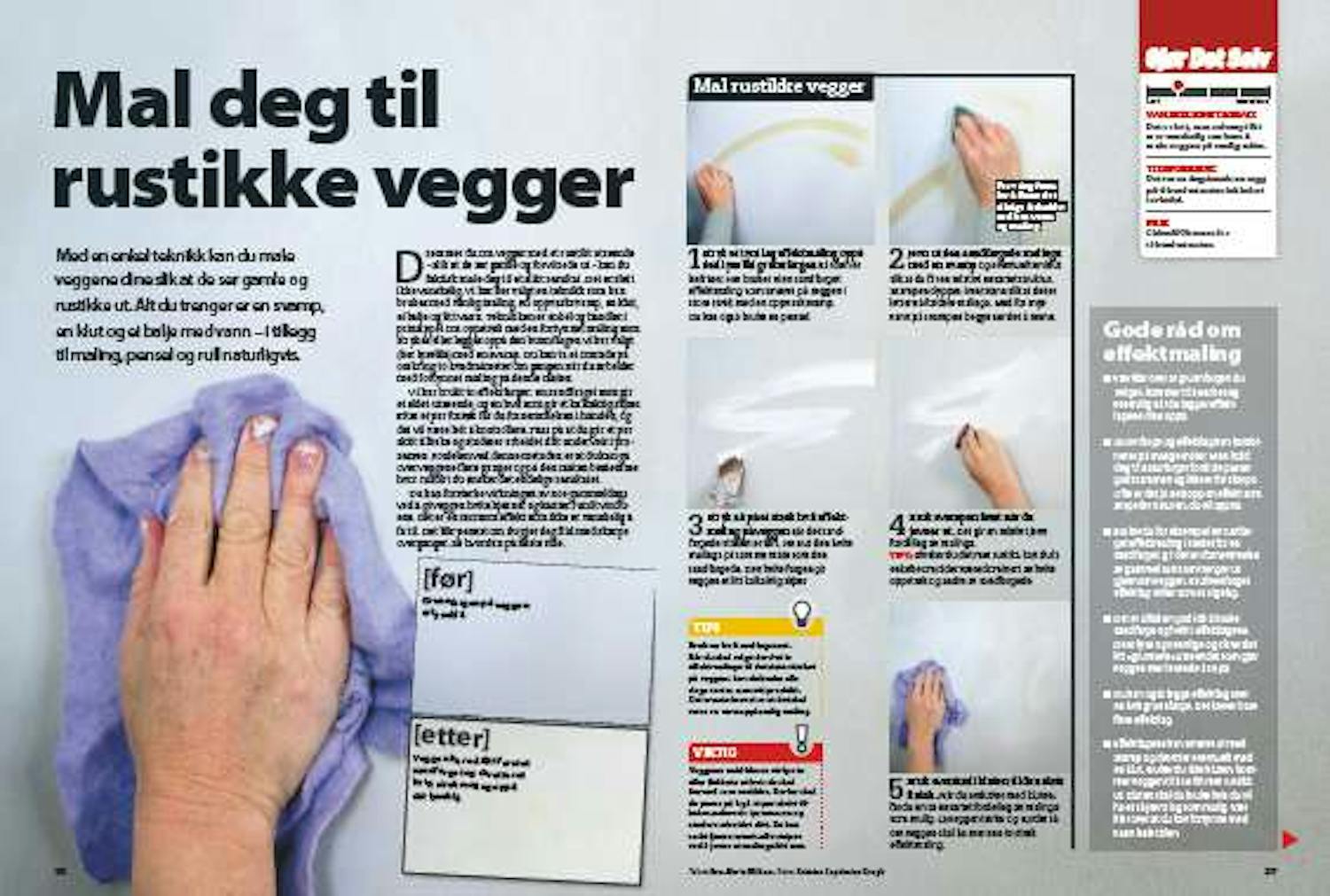 - Effektlagene kan smøres ut med svamp og deretter eventuelt med en klut. Bruker du ikke kluten, kommer veggen til å se litt mer rustikk ut. Kluten skal du bruke hvis du vil ha et så jevnt lag som mulig. Vær klar over at du kan fortynne med vann hele tiden.
