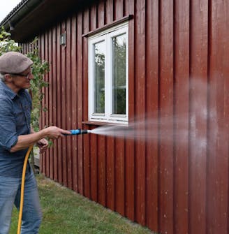 Uansett om treverket er malt tidligere, skal det vaskes før du maler. Bruk en sterk husvask og spyl det av med rent vann. Bruk vannslange, ikke høytrykksvasker. Den kan ødelegge treet.