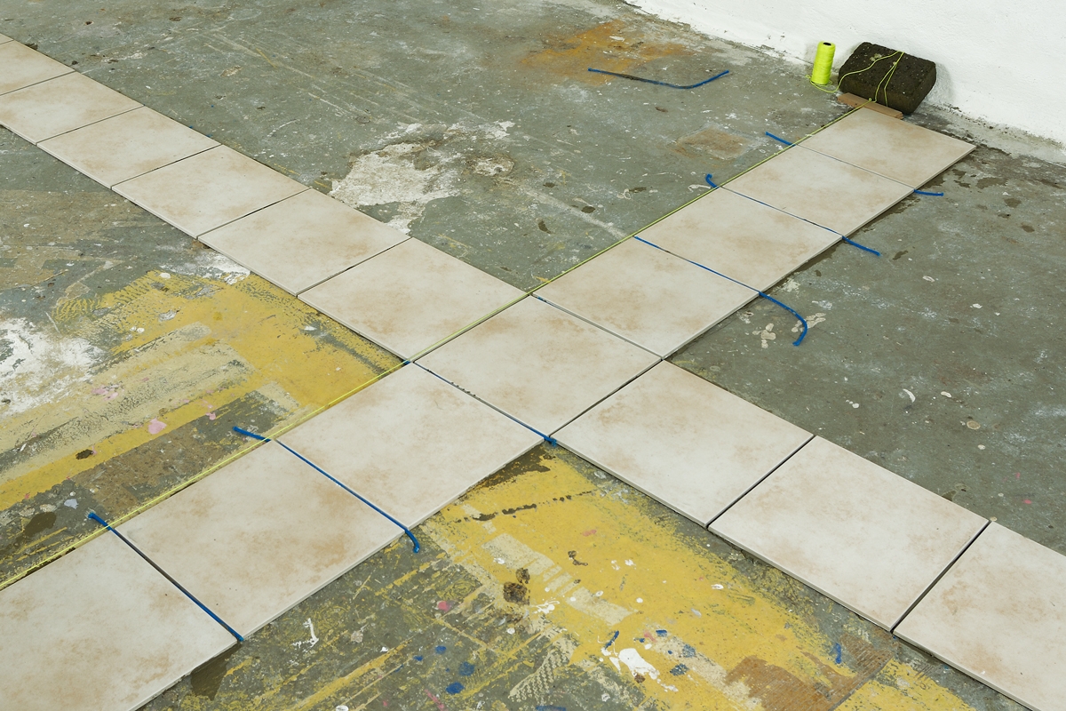 Når kabalen er gått opp, spenner du ut en snor og smører lim på gulvet, slik at du kan legge den første hele rekken med fliser. Legg deretter den tverrgående rekken – også med start midt i rommet. Dermed er du godt i gang.
