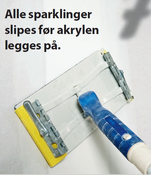 Akrylfugemasse gir en flott og tett avslutning i hjørner, rundt rør og andre sprekker når du bygger en gipsvegg. Men herdet akryl kan ikke slipes, og den gjør det umulig å slipe godt i nærheten. Derfor skal du ikke lade fugepistolen før du er ferdig med å slipe og har primet platene og sparklingene, slik at støvet er bundet.