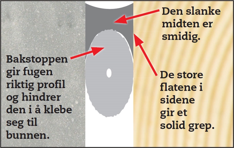 Fuger mellom to emner, som beveger seg i forhold til hverandre, holder bare tett hvis de kan gi seg i bredden uten å miste grepet i sidene. Og her er det ikke nok at materialet er elastisk: Fugens tverrsnitt er helt avgjørende for at den utnytter materialets elastisitet. Fugen skal bygges opp slik at den på midten er tynn og derfor smidig, og i sidene skal den være tykk, slik at den har stor klebeflate. Og fugen må ikke sitte fast i bunden, for da mister den fort grepet i den ene eller begge sider. Virkelig elastiske fuger bygger du derfor opp oppå en rund bakstopp av glatt skumplast, som dels dekker bunnen, dels gir fugen en smal og fleksibel midt, samt store klebeflater i siden.