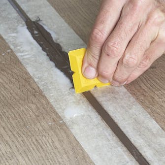 Fyll i fugemasse, slik at den ferdige fugen kommer 1 mm bak forkanten. Dekk til med maskeringsteip på forhånd.