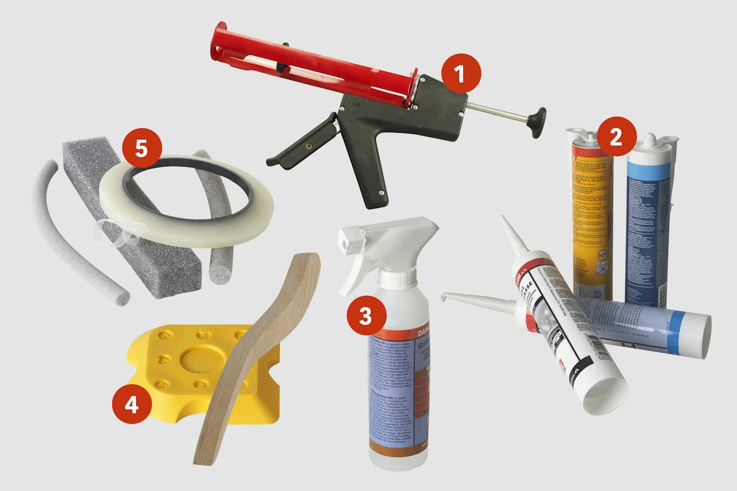 Materialer: MS-fugemasse eller byggsilikon, rundt bakstopp, maskeringsteip, fugebrikke og evt. primer.