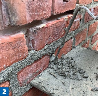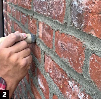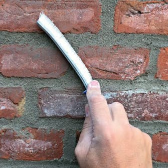 Børst overskytende mørtel av mursteinene med en hard børste. Husk igjen å jobbe i diagonale bevegelser, slik at du ikke kommer til å skade fugen og den negative rundingen vi har gitt den.