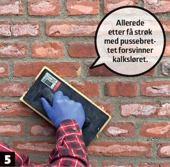 Men ta det bare rolig. Når du først har glattet fugene og avsyret dem, slik at det hvite kalksløret forsvinner, får murverket karakter. Etter et par år med vind, sol og nedbør vil fuger og murverk “smelte sammen” og få den helt riktige patinaen.