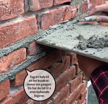 Selve fugeprosessen er ganske enkel. Vi blander mørtelen med vann, og konsistensen skal være så tykk at den kan trykkes inn mellom mursteinene uten at den renner ned langs veggen. Med en god klump med mørtel på pussebrettet er det bare å trykke fugene på plass med en smal fugeskje.