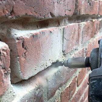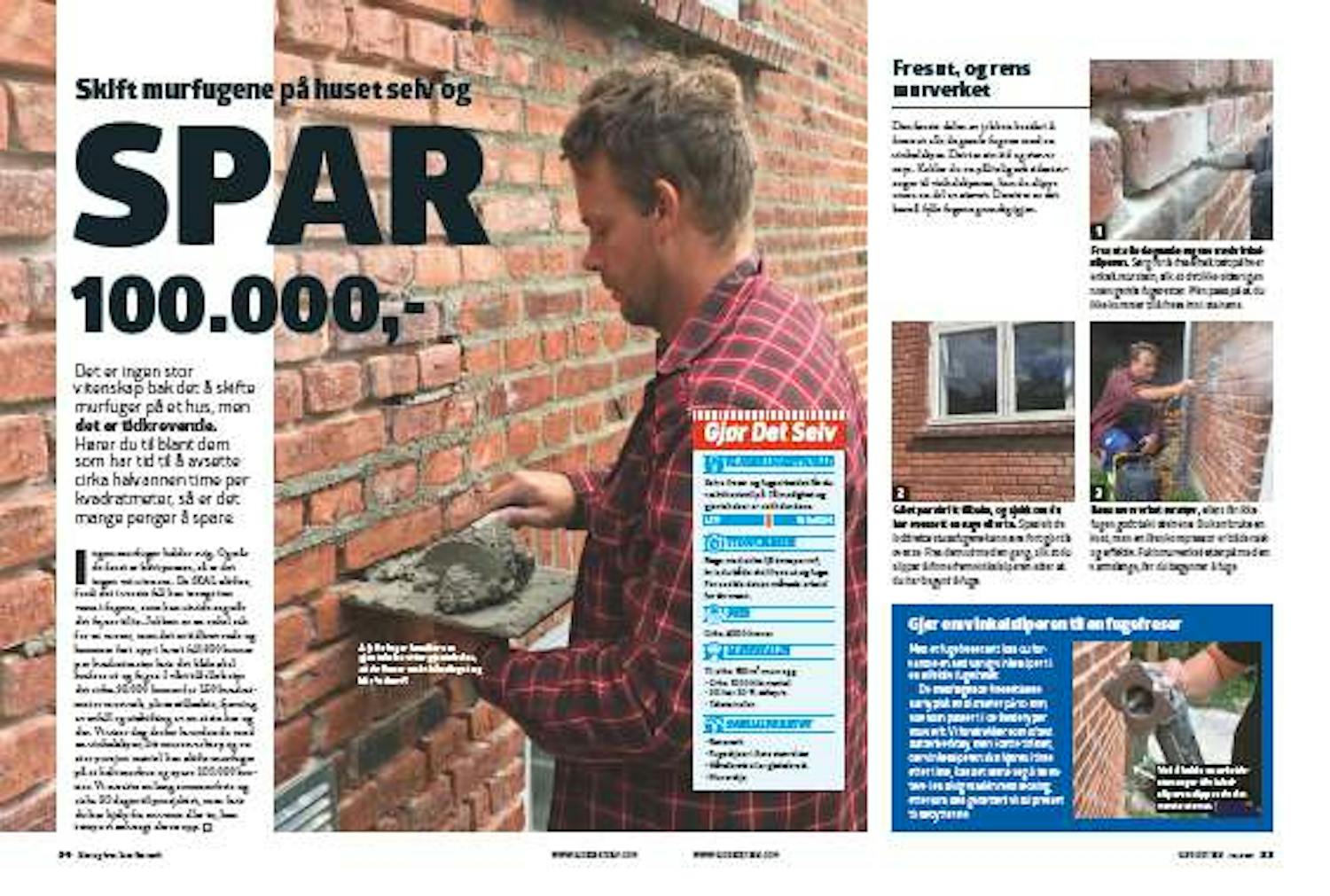 Fres ut alle de gamle fugene med vinkelsliperen. Sørg for å frese helt tett på hver enkelt murstein, slik at det ikke sitter igjen noen gamle fugerester. Men pass på at du ikke kommer til å frese inn i steinene.